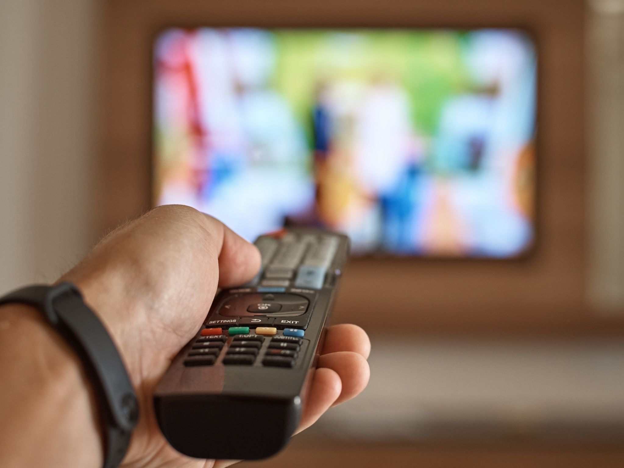 Eine Person hält eine Fernbedinung vor einen Fernseher. Der Fernseher ist nur unscharf im Hintergrund zu erkennen.