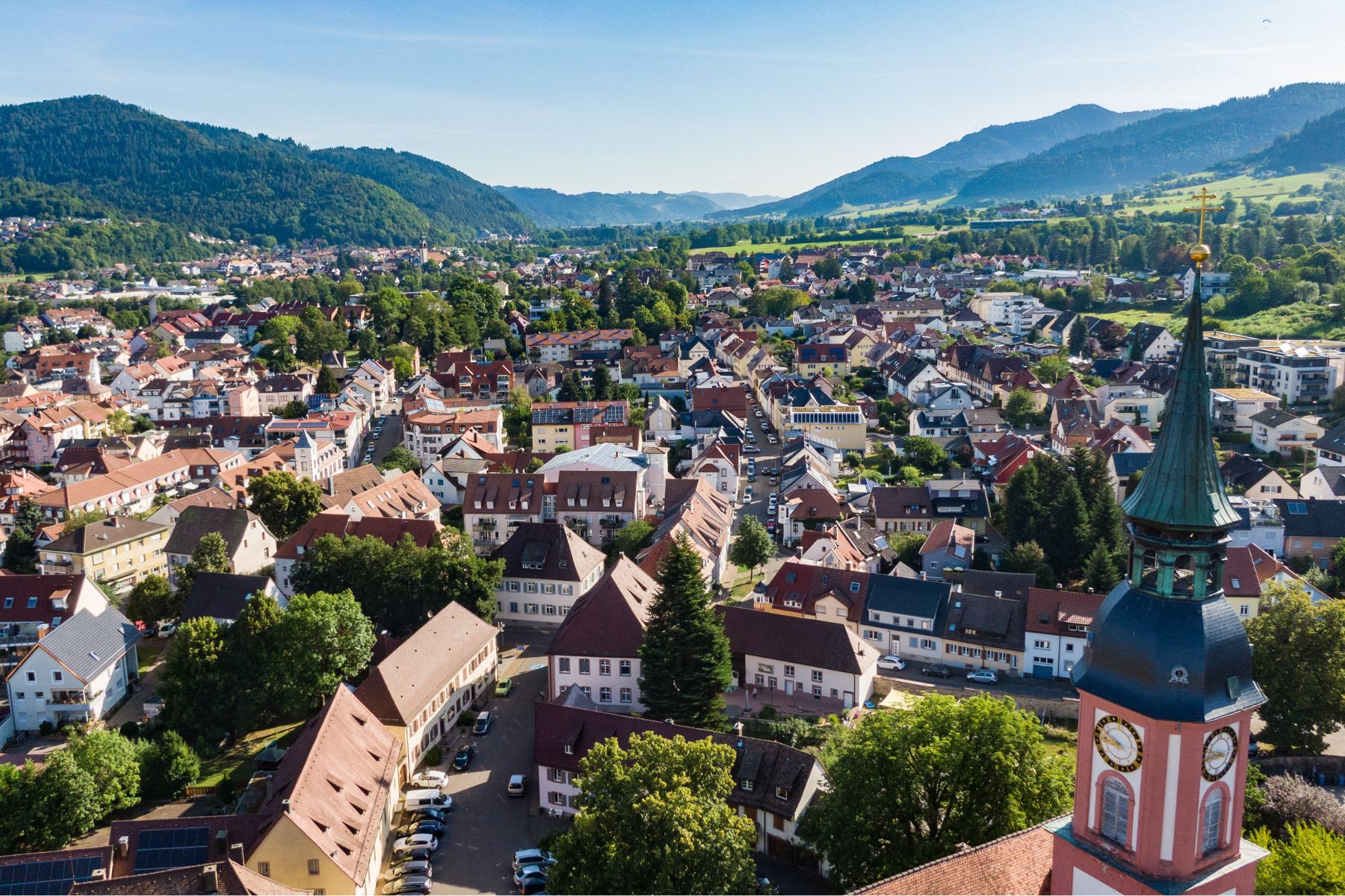 Stadtansicht von Waldkirch. Im Vordergrund ist der Kirchturm von St. margarethen.