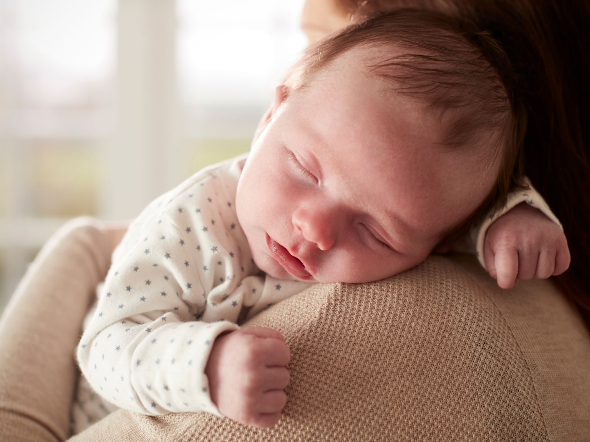 Ein Neugeborenes liegt auf der Schulter von seiner Mutter. Es schläft.