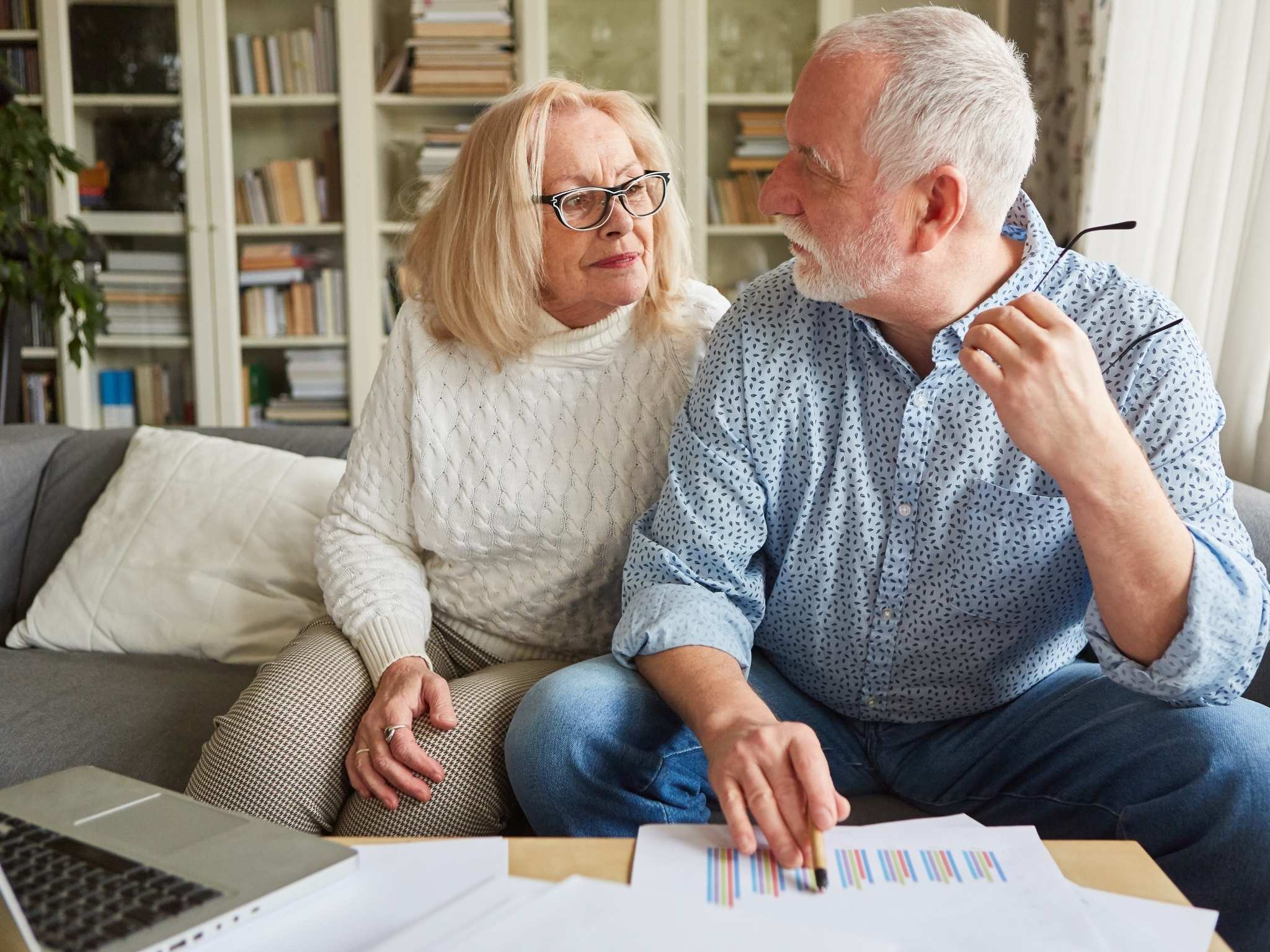 Zwei ältere Menschen sitzen auf einem Sofa. Auf dem Couchtisch vor ihnen liegen viele Zettel und ein Laptop.