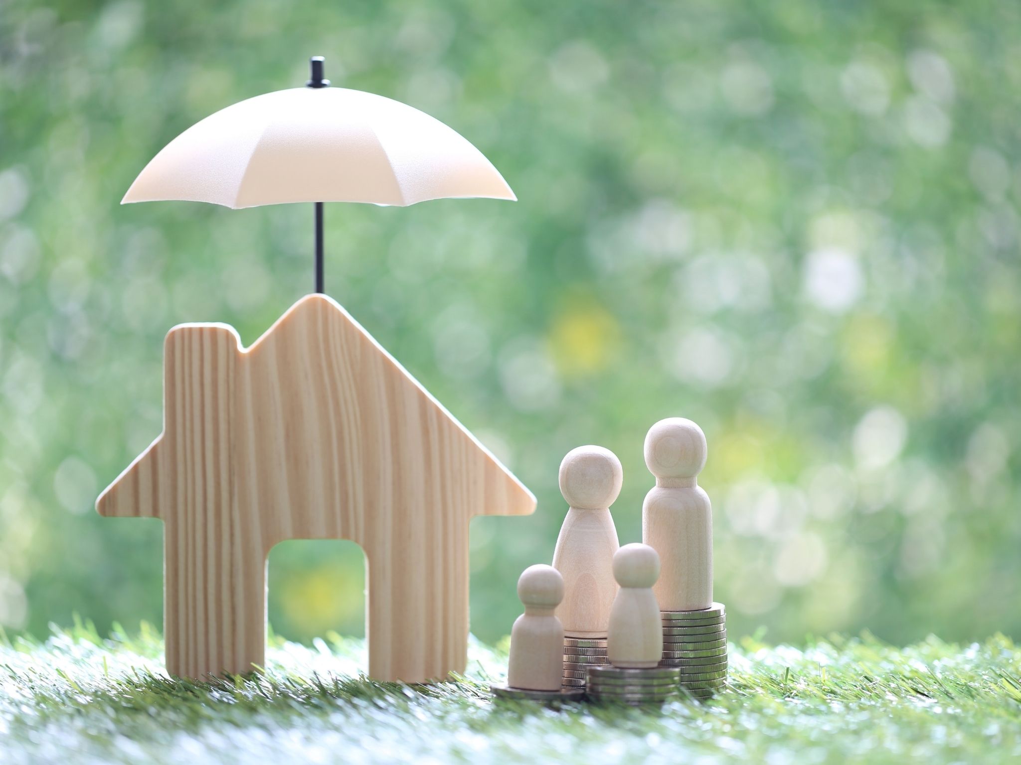 Ein Holzspielhaus steht auf einer Wiese. Davor stehen ein paar Holzfiguren auf Geldstapeln.