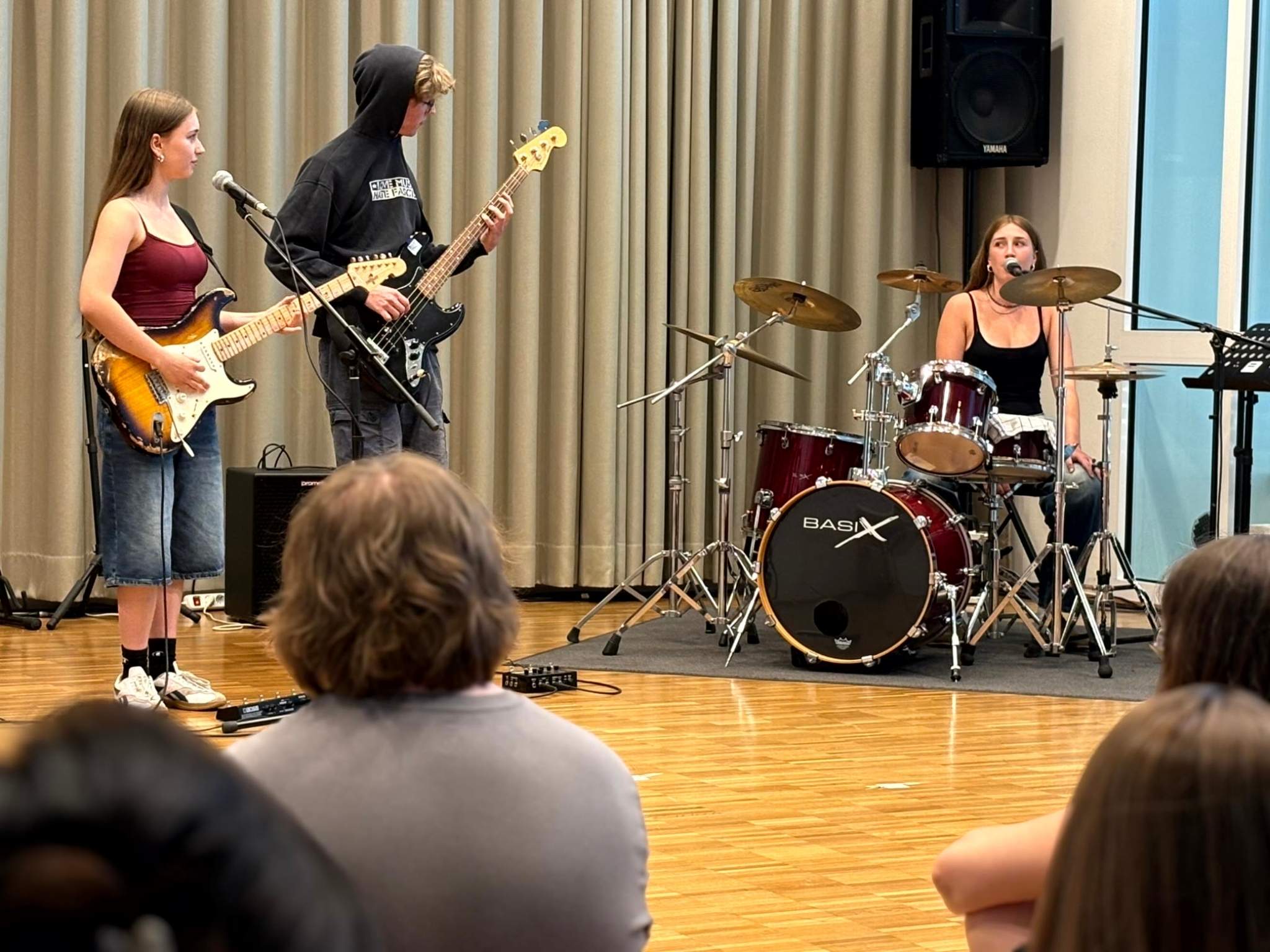 Annette Schlünz lies in ihrem Stück „3x3-Wünsche“ die Wünsche der drei jungen Musikerinnen und Musiker einfließen. Manche der Wünsche klangen ganz laut, andere leise, manche sanft, andere schrill. Rockig wurde es bei „Free“ von Hannes Seidl: Statt auf Stühlen nahm das Publikum auf dem Boden vor der Band Platz. Das Stück begann ruhig am Klavier, bevor die Musikerinnen und Musiker zu E-Gitarre, Bass und Schlagzeug griffen und die Musik kraftvoll Fahrt aufnahm.
