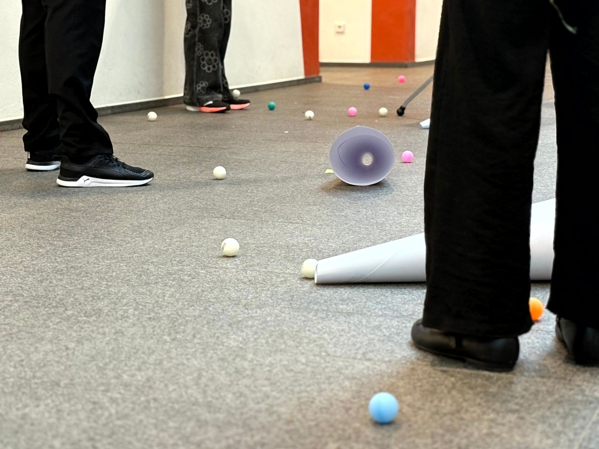 Zum Abschluss ging es mit „Sing your song, my friends!“ von Sophie-Youjung Lee ins Treppenhaus. Die Instrumente dort: fallende Tischtennisbälle, ein Streicher-Bogen über Styropor gezogen und eine Luftpumpe. Die besondere Akustik und die ungewöhnlichen Klänge machten das Treppenhauskonzert zu einem eindrucksvollen Erlebnis.