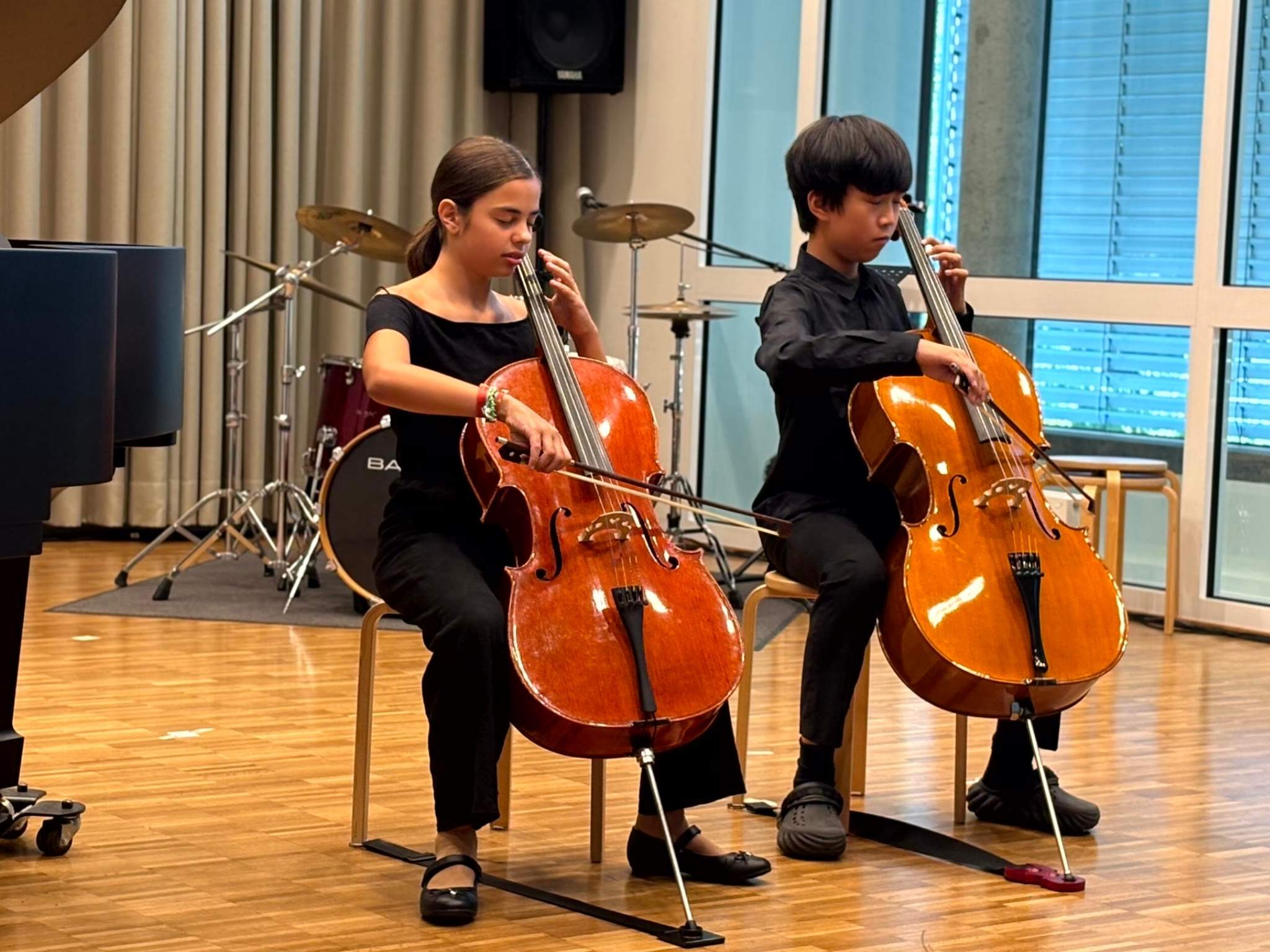Ganz in Schwarz gekleidet spielten die Schülerinnen und Schüler das „Hörbarium“ von Maximiliano Soto Mayorga. Mit geschlossenen Augen ließen sie ungewöhnliche Klänge entstehen: bliesen mal nur ins Mundstück des Fagottinos oder zupften mit den Fingern an den Saiten des Klaviers. Bei Benjamin Scheuers „Schilltröten“ kamen unterschiedlich gefüllte Glasflaschen und elektronische Einspieler zum Einsatz. Das Stück begann mit dem fröhlichen Spiel einer Querflöte. Dazu pusteten die anderen Musikerinnen in unterschiedlich gefüllte Glasfalschen und erzeugten so verschiedene Töne.