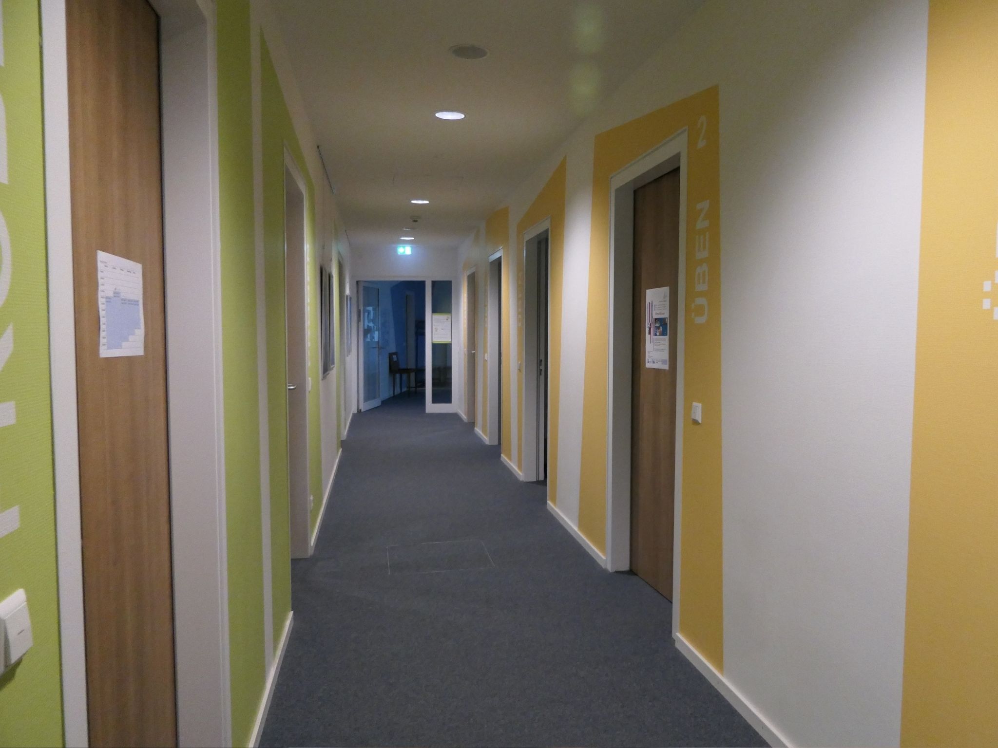 Ein Gang in der Musikschule mit farblich gekennzeichneten Unterrichtsbereichen.