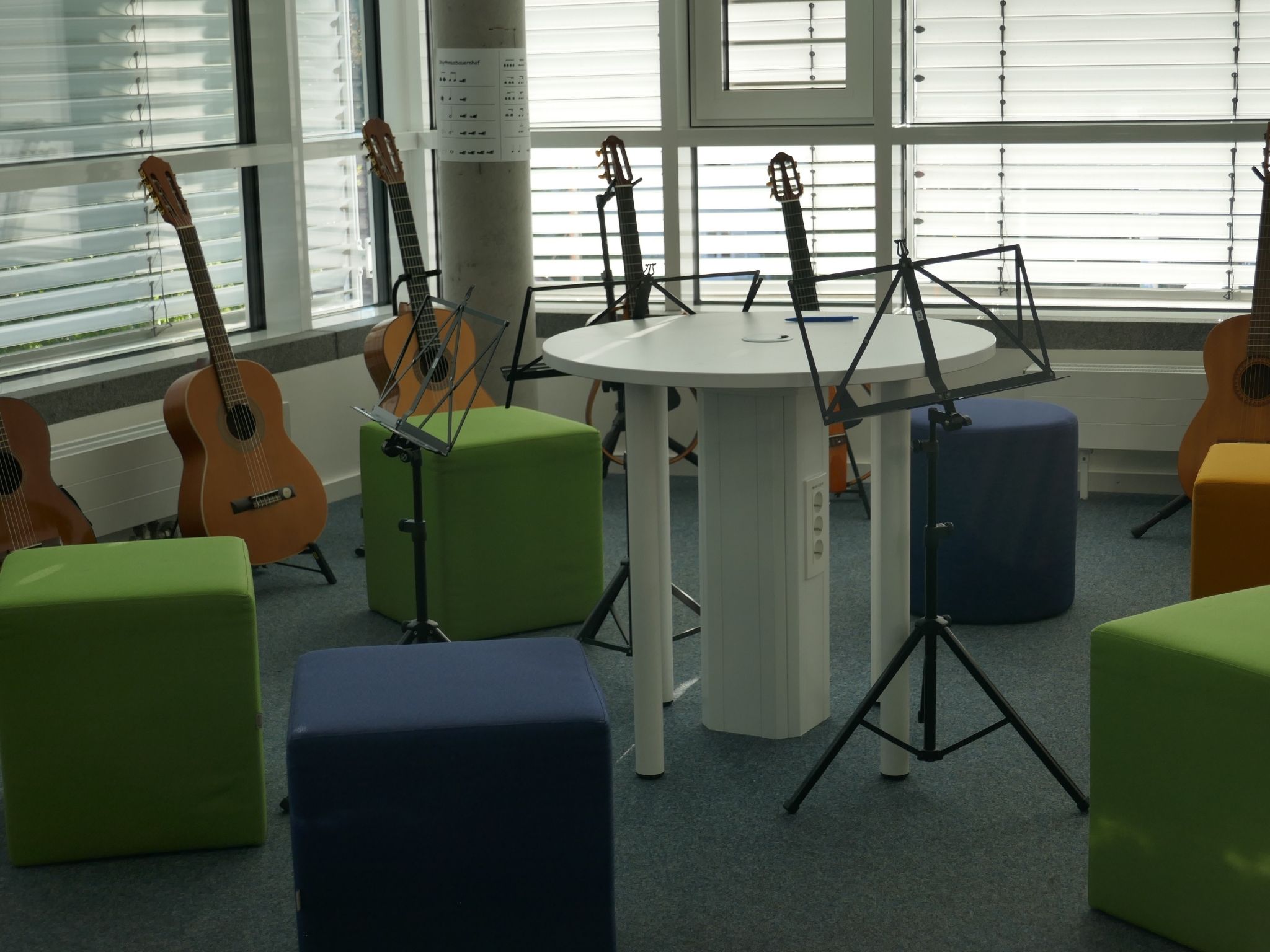 Bunte Sitzmöbel im Silentbereich der Musikschule.