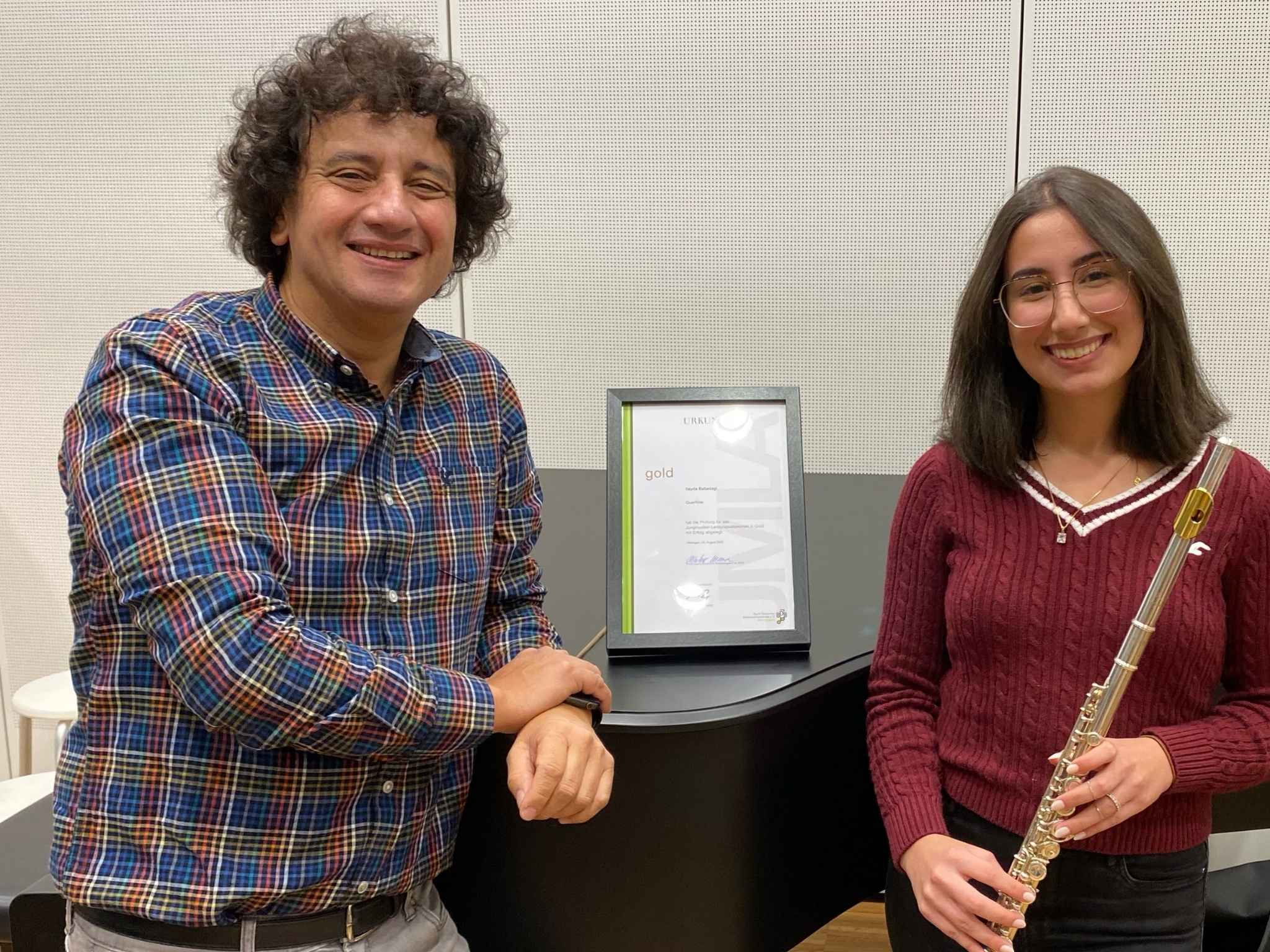 Im Rahmen eines fünftägigen Lehrgangs, der während der Herbstferien 2021 in der BDB-Akademie in Staufen stattfand, konnte Lara Preiss aus Simonswald das Jungmusiker-Leistungsabzeichen (JMLA) in Gold erfolgreich ablegen. Diese ausgezeichnete Leistung wurde auch durch die Unterstützung ihres Heimatvereins, der Trachtenkapelle Simonswald, sowie durch die gute Vorbereitung ihrer Lehrer Alfredo Mendieta (Querflöte) und Vasiliki Kourti-Papamoustou (Musiktheorie) an der Musikschule Waldkirch ermöglicht.