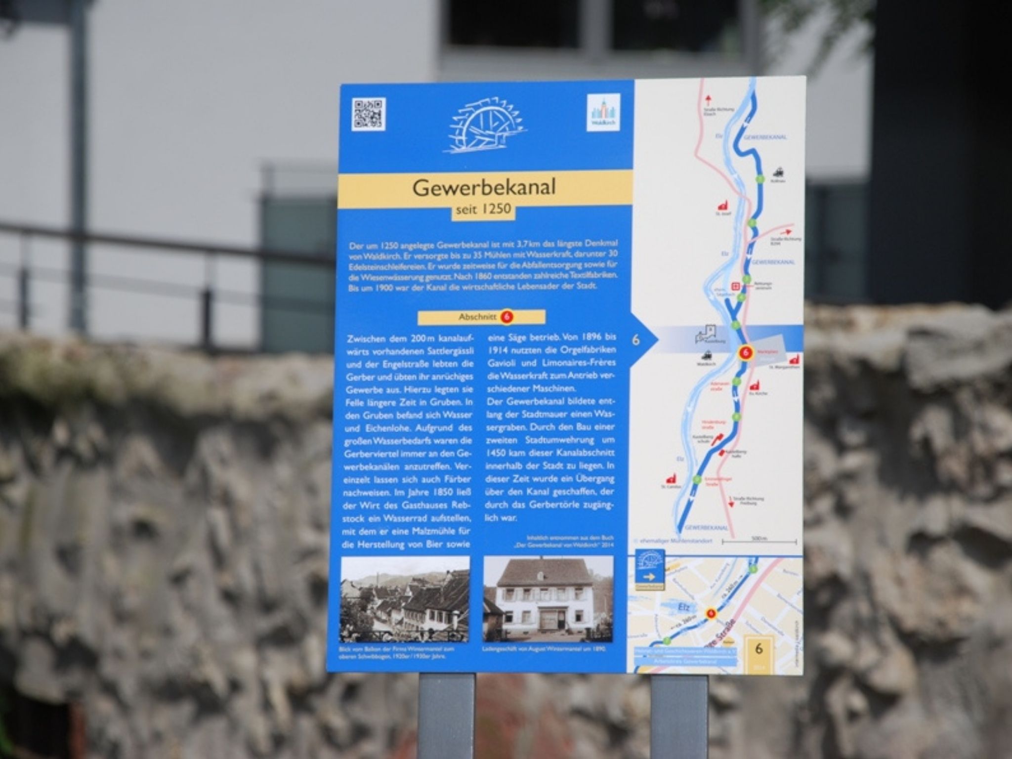 Der um 1250 angelegte Gewerbekanal ist mit 3,7 Kilometern das längste Denkmal Waldkirchs. Bis zu 35 Mühlen, darunter 30 Edelsteinschleifereien, wurden mit Wasserkraft versorgt. Später diente er der Abfallentsorgung und Wiesenwässerung. Nach 1860 entstanden Textilfabriken. Bis 1900 war der Kanal die wirtschaftliche Lebensader. Dank des Engagements des Heimats- und Geschichtsvereins Waldkirch säumen neun Tafeln den Waldkircher Gewerbekanal vom Kollnauer Bahnhof bis zur Galgenbrücke auf der Höhe der Firma Faller. Sie illustrieren dessen Geschichte.