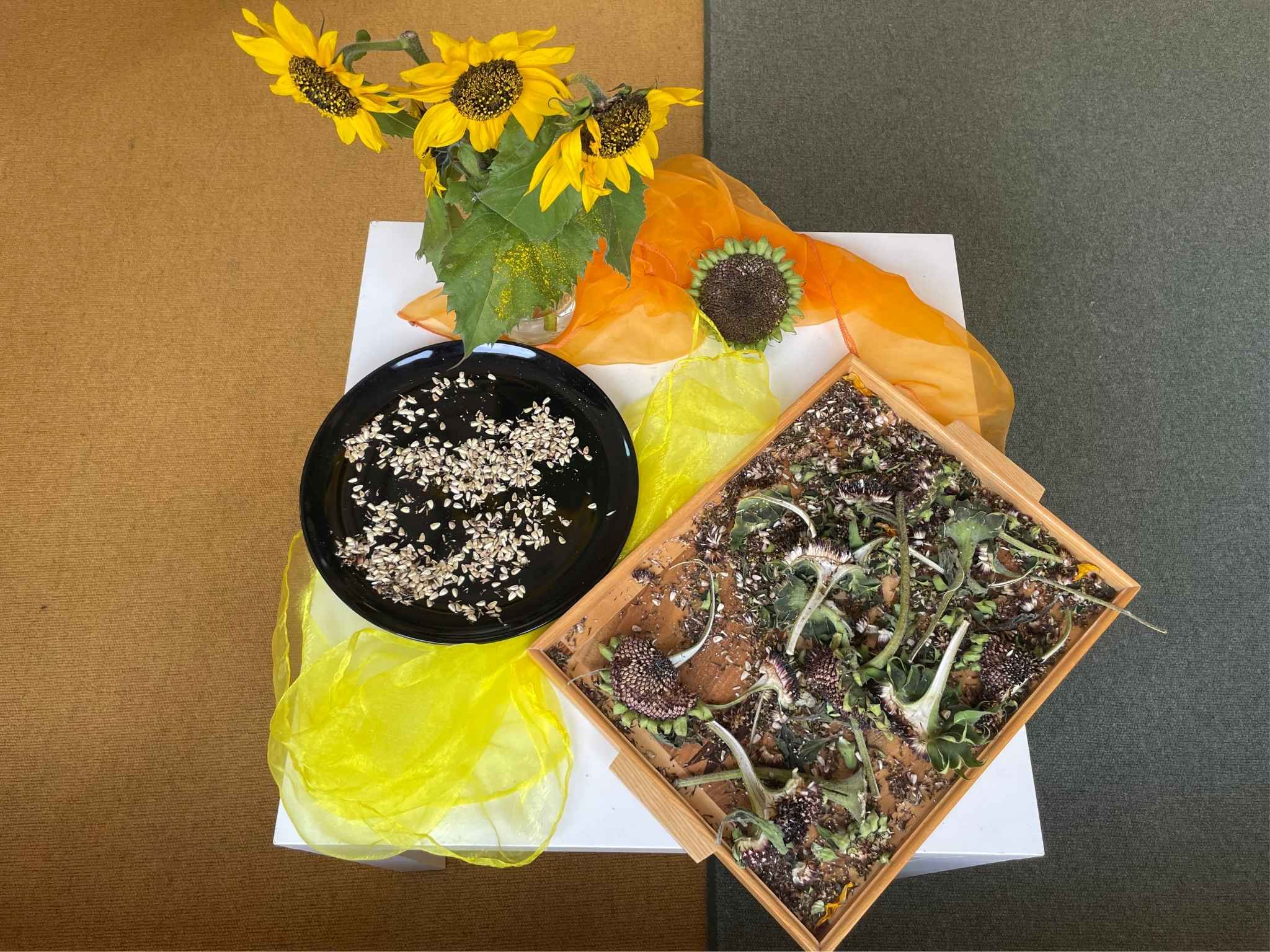 Was passiert mit den Blütenblättern der Sonnenblume, wenn sie abfallen? Wie fühlt sich der Blütenkopf an? Und wie sind die Kerne angeordnet? Mit diesen und vielen weiteren Fragen rund um die Sonnenblume haben sich die Kinder der Kita Regenbogen beschäftigt. Außerdem haben sie die Kerne aus den Blütenköpfen gelöst und getrocknet, um Samen für das kommende Jahr zu haben.