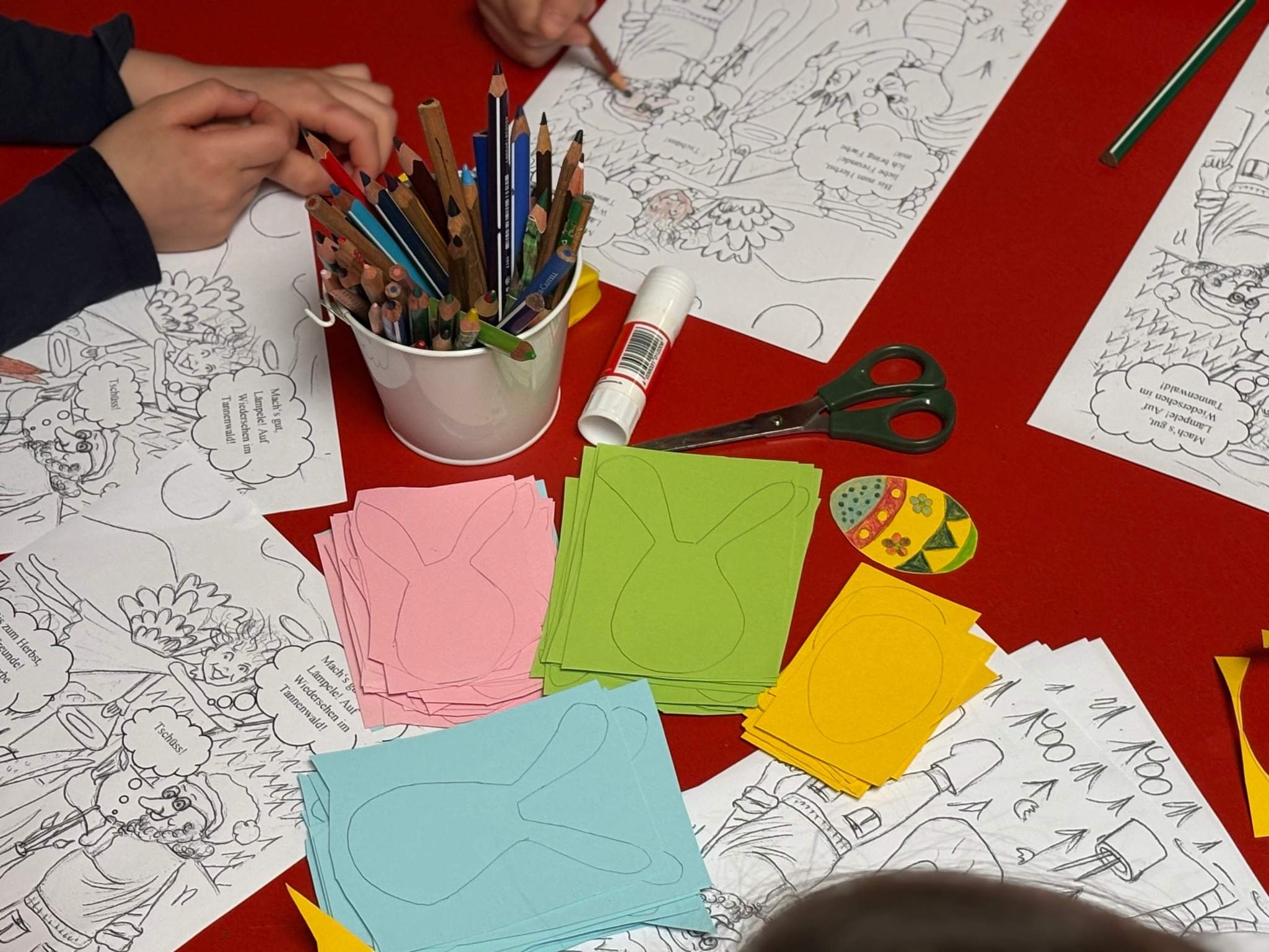 Nach der Lesung hatten die Kinder viele Fragen: Woher weiß Meister Lämpele, wo Knecht Ruprecht wohnt? Hast Du die Bilder selber gemacht? Passend zum Osterfest konnten die kleinen Zuhörerinnen und Zuhörer danach selbst kreativ werden: Sie durften die letzte Seite des Buches ausmalen oder kleine Hasen und Ostereier bemalen.