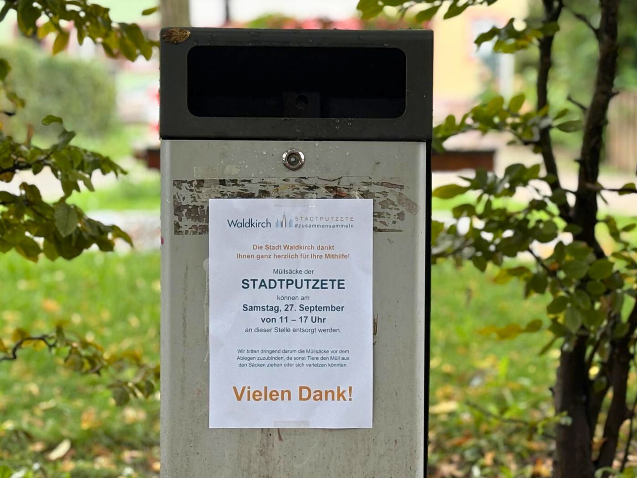 Die Stadt Waldkirch ruft gemeinsam mit den Technischen Betrieben Waldkirch (TBW) alle Bürgerinnen und Bürger zur Stadtputzete am Samstag, 27. September, auf. Dann gilt es wieder gemeinsam Plastikmüll, Flaschen oder anderen Abfall im Stadtgebiet zu sammeln und abzugeben. Alle sind herzlich eingeladen, sich einer von zwei Stadtputzete-Gruppen anzuschließen. Die Gruppen starten jeweils um 9 Uhr am Pavillon in der Schlettstadtallee oder beim Roten Haus, Emmendinger Str. 3. Müllsäcke werden an allen Treffpunkten bereitgestellt. Handschuhe und Warnwesten werden empfohlen, können aber nicht gestellt werden. Kinder dürfen nur in Begleitung von Erwachsenen teilnehmen.