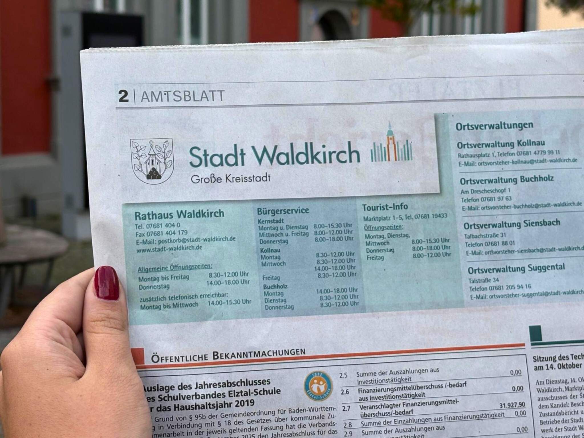 Das Amtsblatt der Stadt Waldkirch veröffentlicht wöchentlich, in der Regel donnerstags, amtliche Bekanntmachungen sowie weitere Informationen innerhalb des Elztäler Wochenberichts. Die vergangenen zehn Ausgaben stehen hier zum Download bereit. Für den Zugriff auf ältere Ausgaben können Sie eine E-Mail an presse@stadt-waldkirch.de schreiben.