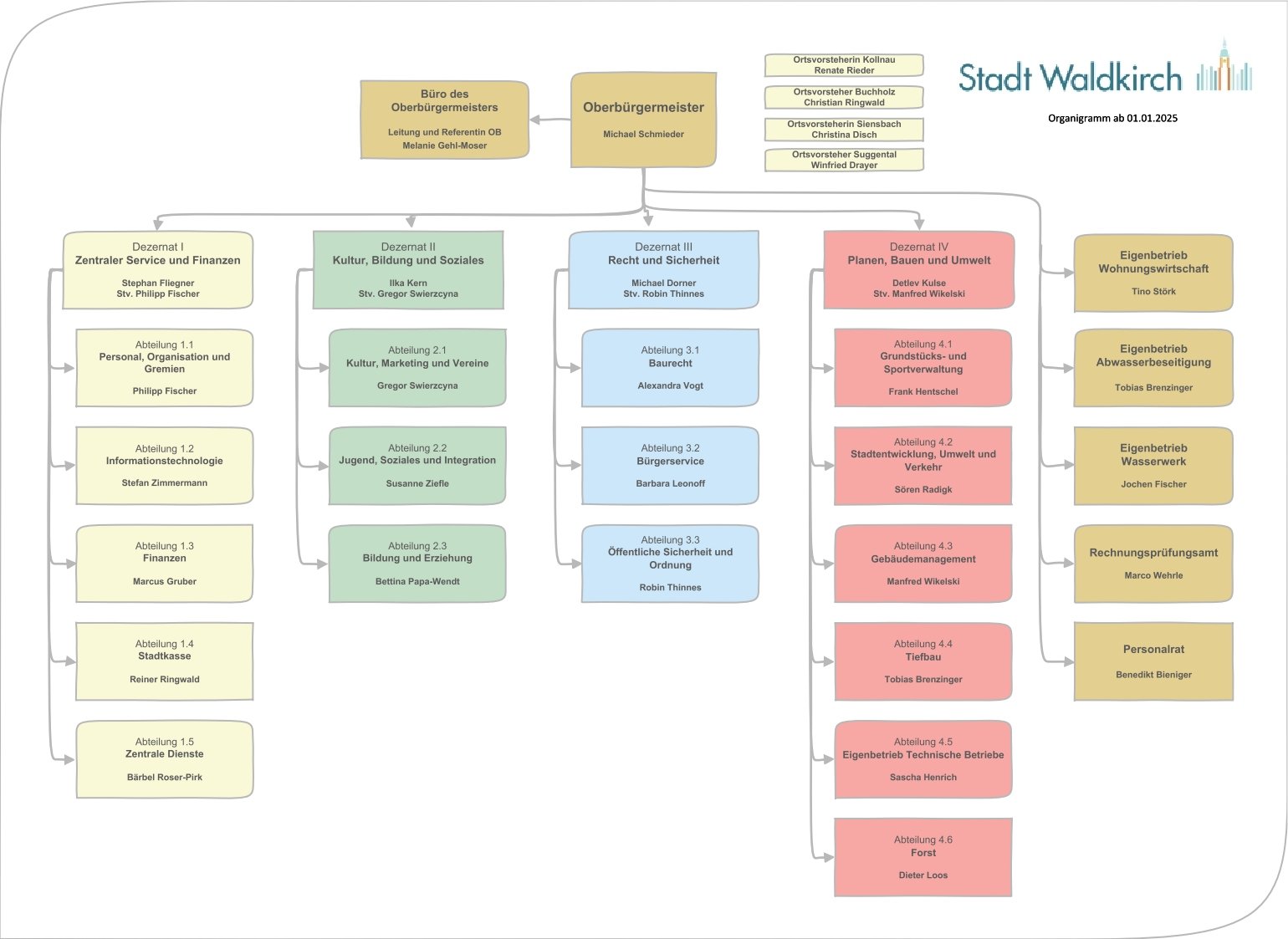 Das Organigramm der Stadt Waldkirch gibt Ihnen einen klaren Überblick über die Aufbau- und Ablauforganisation unserer Verwaltung. Hier sehen Sie, welche Abteilung wer für welche Aufgaben zuständig ist. So wird transparent, wie die Stadtverwaltung arbeitet, wer die Ansprechpersonen sind und wie die internen Strukturen aufgebaut sind. Das Organigramm der Verwaltung der Stadt Waldkirch steht Ihnen auch zum Download zur Verfügung: