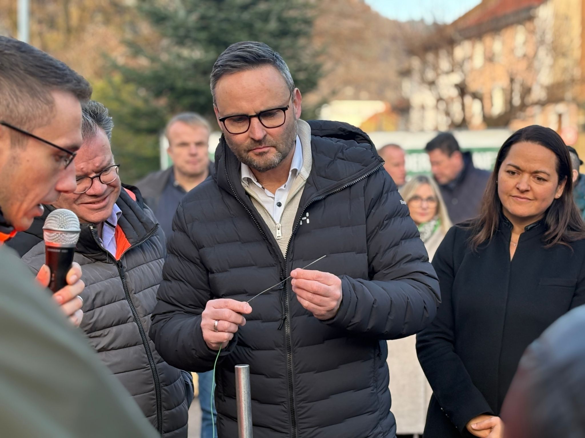 Auch Christopher Beußel von der Telekom richtete einige Worte an die Anwesenden und dankte allen Beteiligten für die konstruktive Zusammenarbeit. Eine besondere Demonstration bot anschließend ein beteiligtes Bauunternehmen: Es zeigte live, wie die extrem dünnen Glasfasern – kaum dicker als Bindfäden – miteinander verbunden werden.